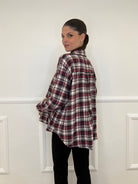 Camicia over in flanella di cotone, in fantasia madras, con fondo asimmetrico, manica scesa e sfondo piega posteriore.