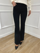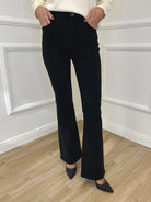 Jeans 5 tasche modello flare a vita medio alta in denim di cotone elasticizzato.