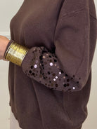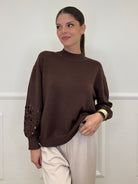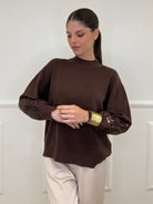 Maglia over a girocollo in viscosa elasticizzata con collo a vulcano e profili rimagliati. Dettaglio maniche calate impreziosite da paillettes tono su tono.