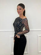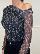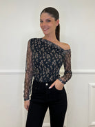 Maglia foderata monospalla, in microrete elasticizzata in fantasia floreale, con scollo drappeggiato. Vestibilità slim.
