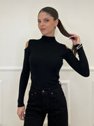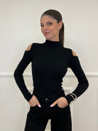 Maglia in viscosa elasticizzata a costine con collo a lupetto e dettaglio spalline cut out. Vestibilità slim.