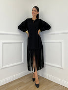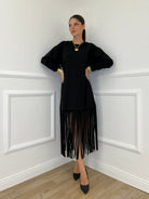 Abito/Maxi Felpa a girocollo in tessuto crepe elasticizzato, con applicazioni frange inferiori.