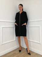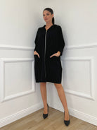 Maxi felpa non garzata in punto milano di viscosa, con cappuccio, chiusura zip frontale e tasche applicate.