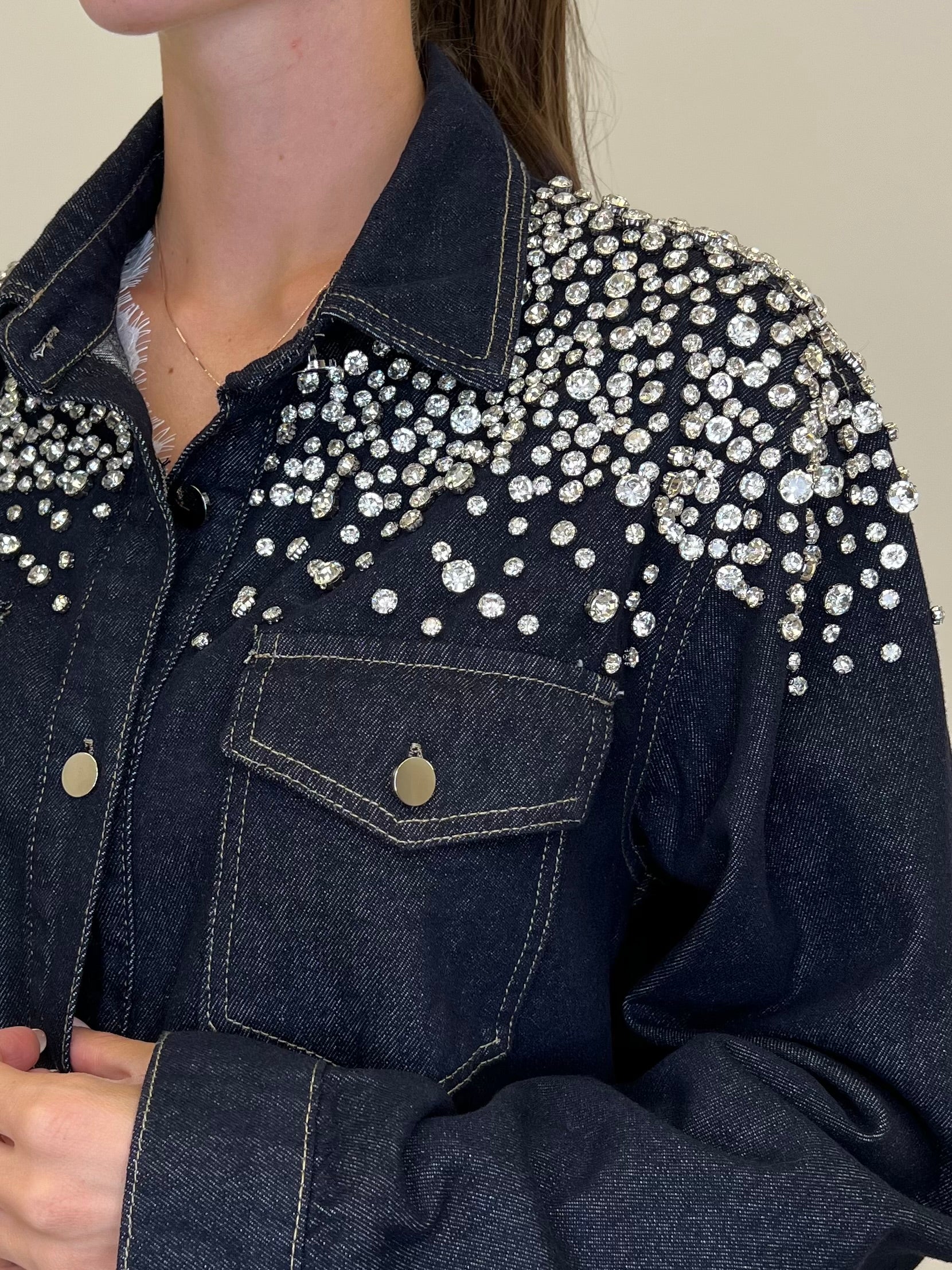 Giacca camicia in denim di cotone, con dettaglio applicazioni cristalli, tasche a patta frontali e chiusure con bottoni metallici ad asola. Fondo leggermente asimmetrico.