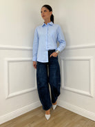 Jeans 5 tasche modello banana a vita media in denim di cotone super elasticizzato.