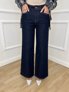 Jeans 5 tasche a palazzo, a vita medio alta, in denim di cotone elasticizzato con impunture a contrasto.