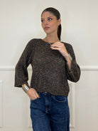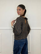 Maglia boucle' multicolor, modello over, in mohair e lana, con maniche raglan e profili rimagliati. Dettaglio scollo goccia posteriore con fiocco regolabile.