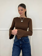 Maglia elasticizzata in viscosa a costine con applicazioni micro paillettes. Dettaglio profili smerlati e maniche a trombetta.