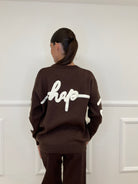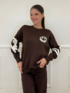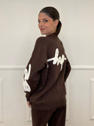Maglia over in viscosa elasticizzata con profili rimagliati e manica scesa. Dettaglio ricami in rilievo a spugnetta a contrasto, frontale, sulle maniche e posteriore.