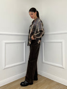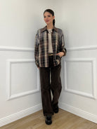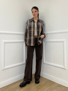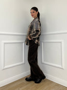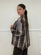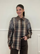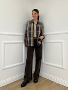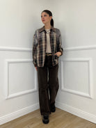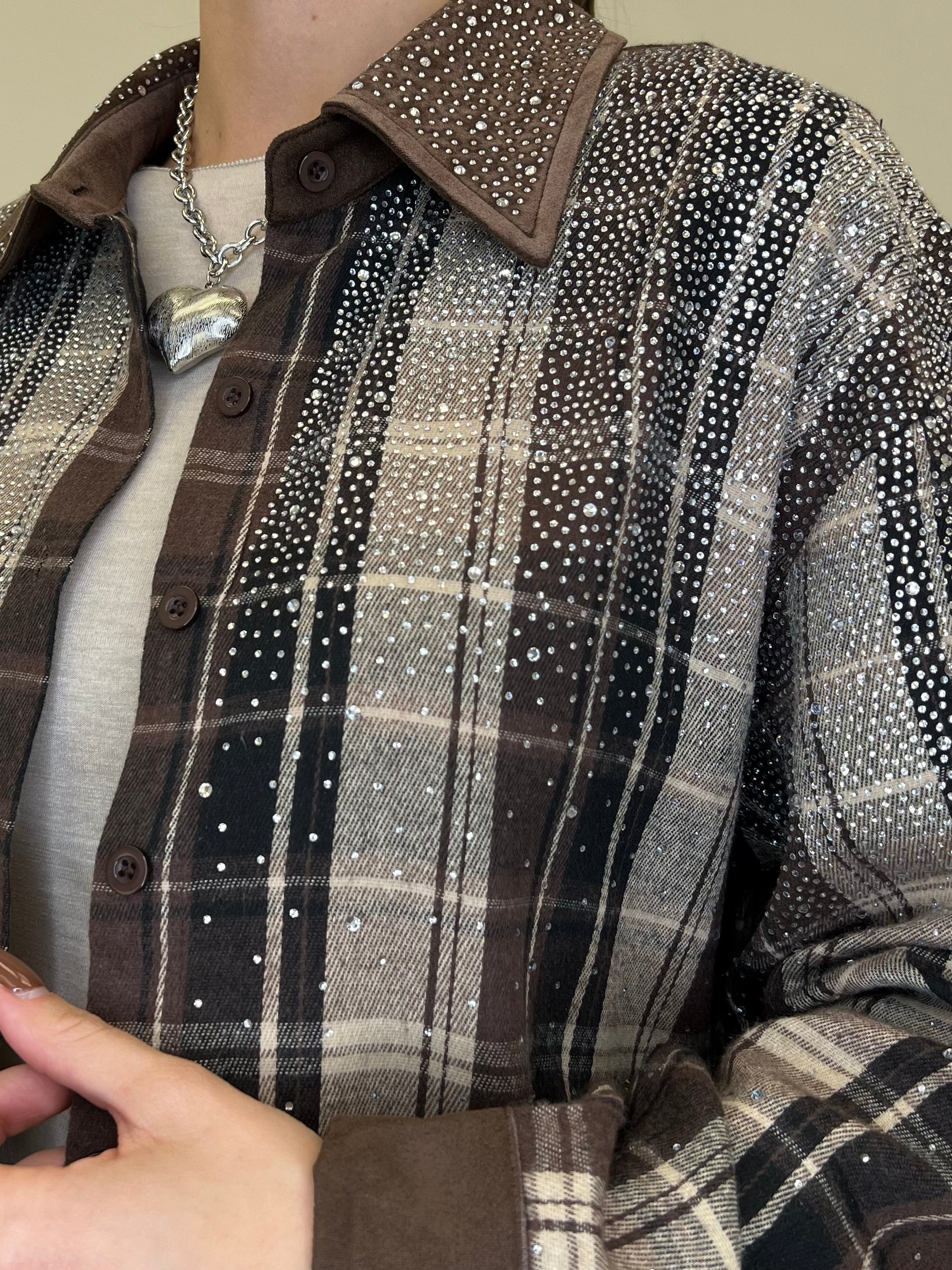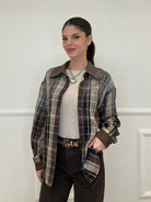 Camicia over in cotone e lana in fantasia madras con applicazioni strass e dettaglio colletto in suede.