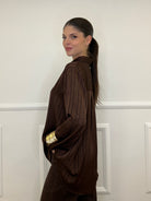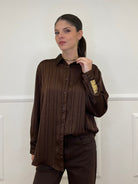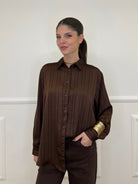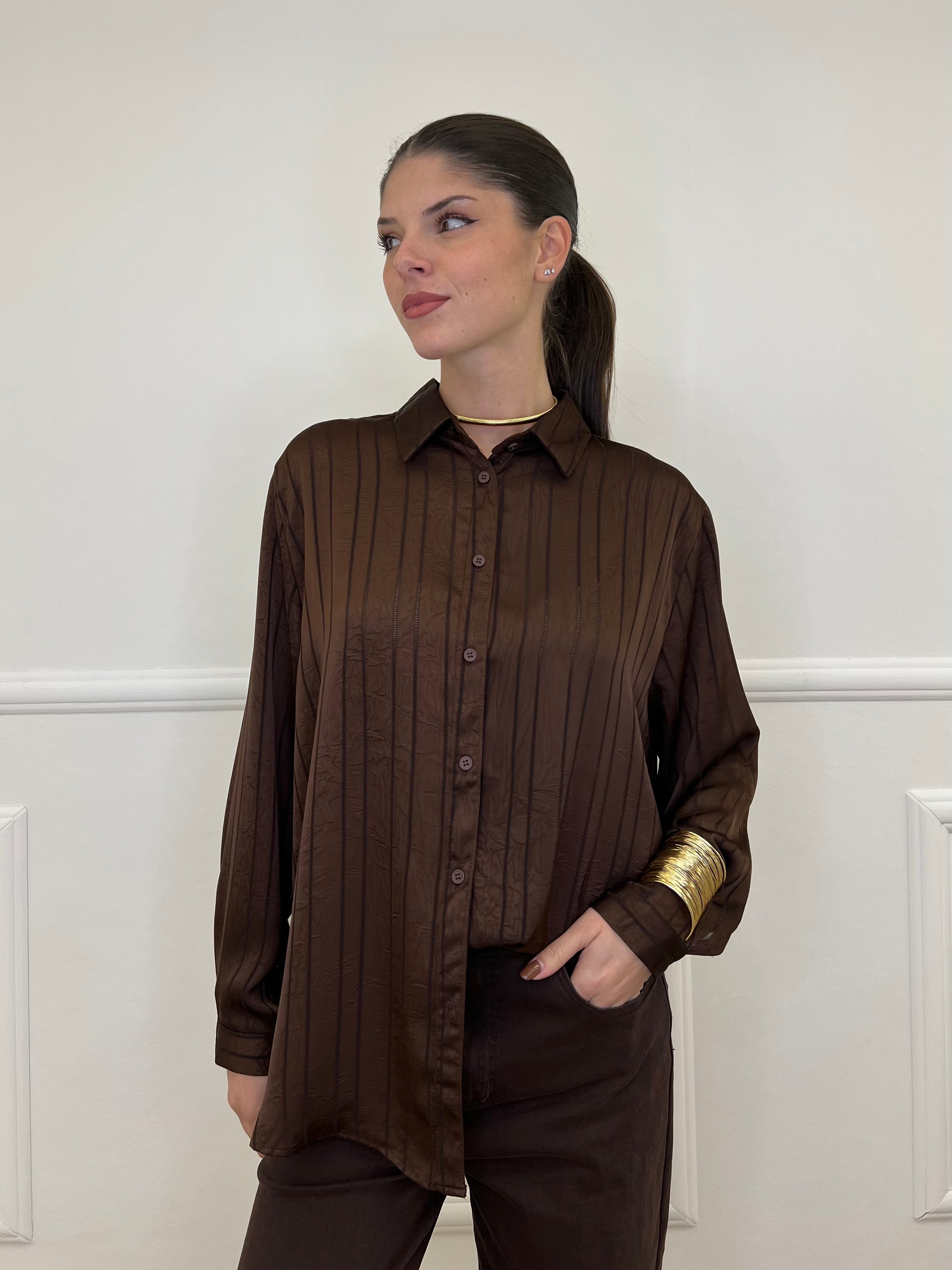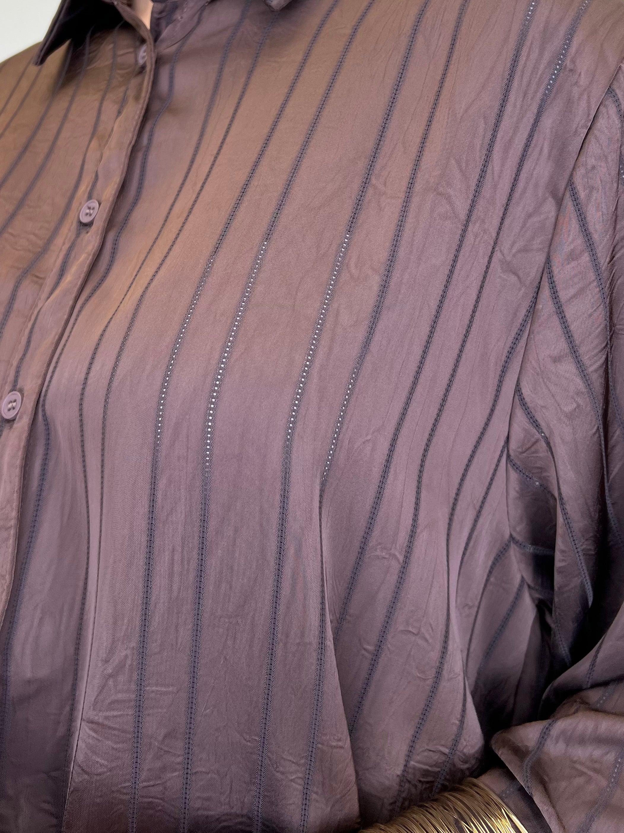 Camicia over in satin di viscosa effetto strop, con trama gessata traforata in trasparenza e fondo tondato.