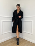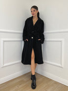 Cappotto monopetto foderato in boucle' con fusciacca rimovibile, tasche laterali e bottoni metallici operati.