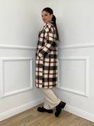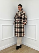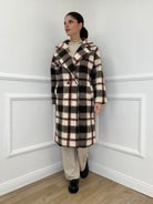 Cappotto foderato, leggermente over in lanacotta, in fantasia madras, con chiusura a doppiopetto e tasche a filetto laterali.