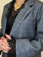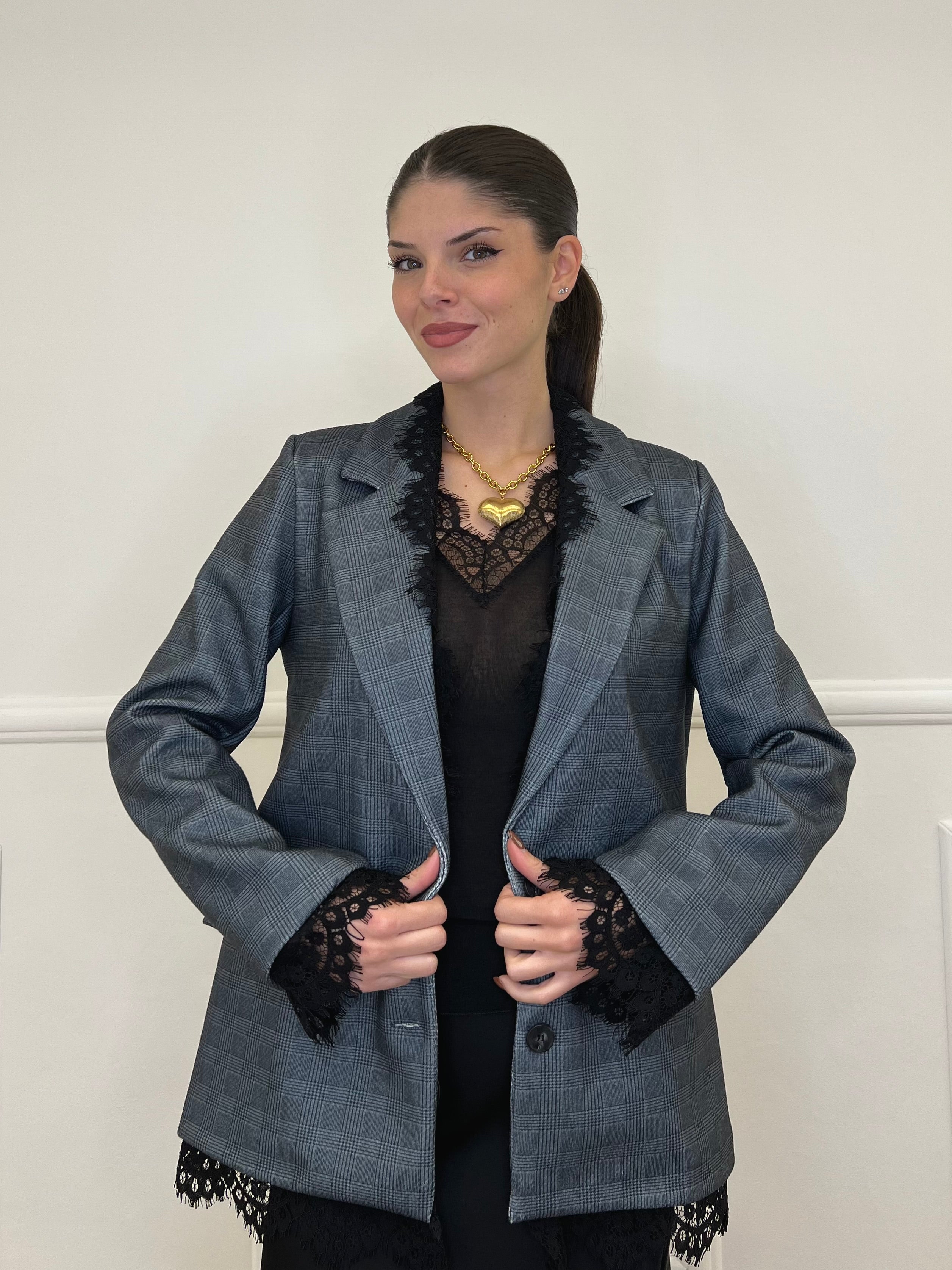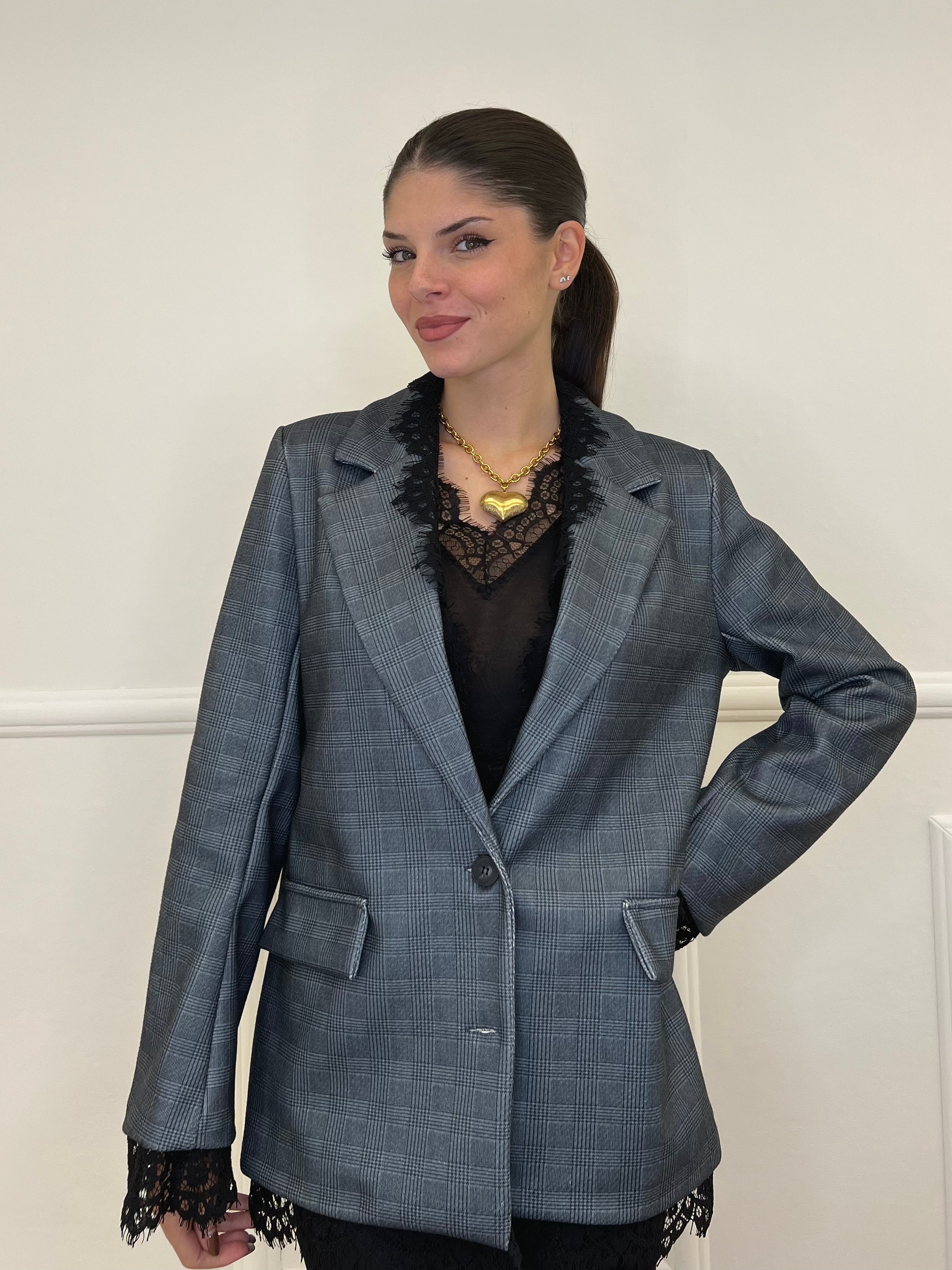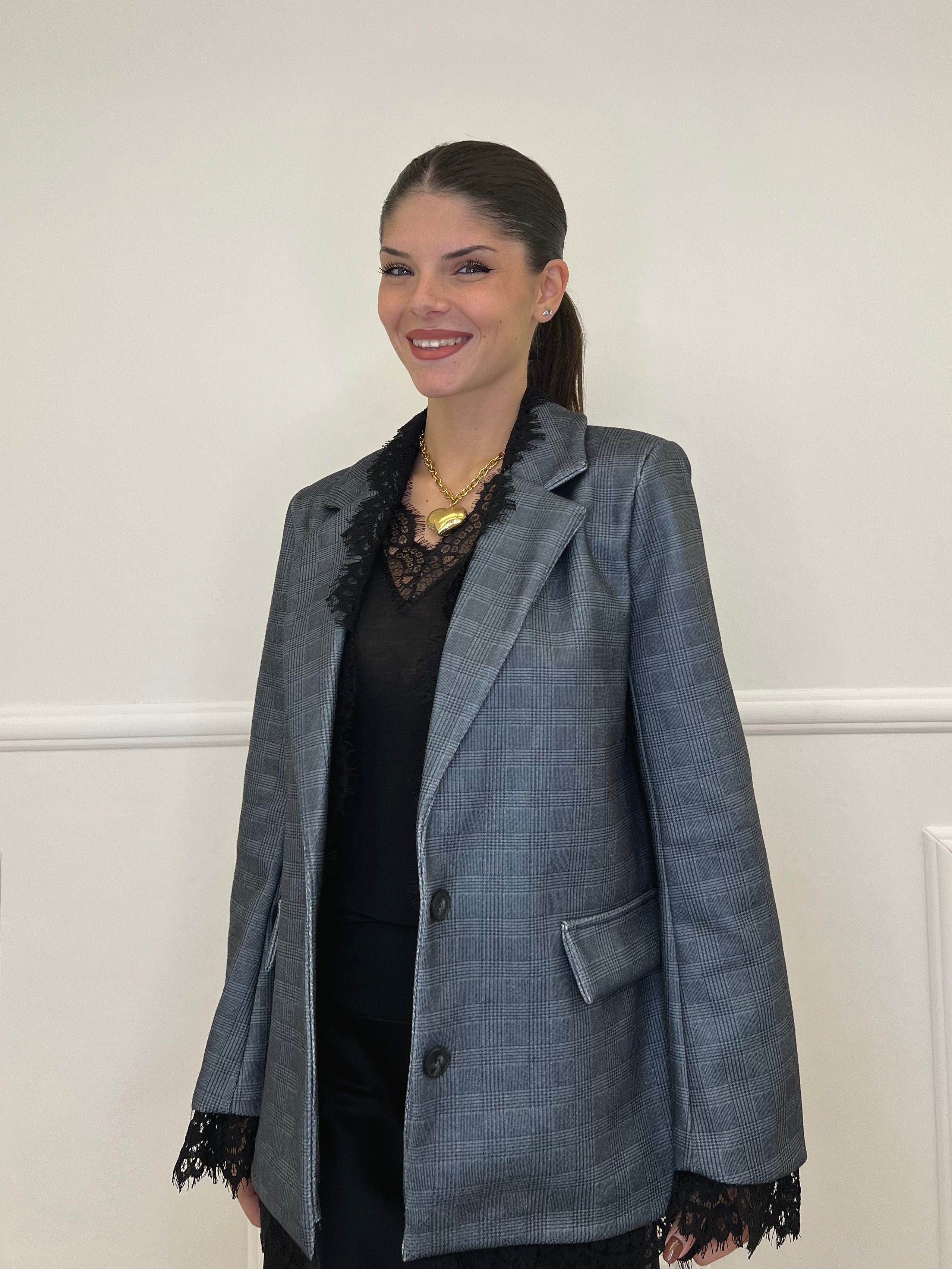 Giacca over monopetto foderata, in principe di galles, con spalline rinforzate, finte tasche frontali e inserti in pizzo.
