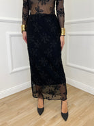 Gonna midi coordinata in tulle elasticizzato con ricami in rilievo "all over" in velluto tono su tono. Dettaglio vita elastica e sottogonna foderato.