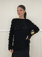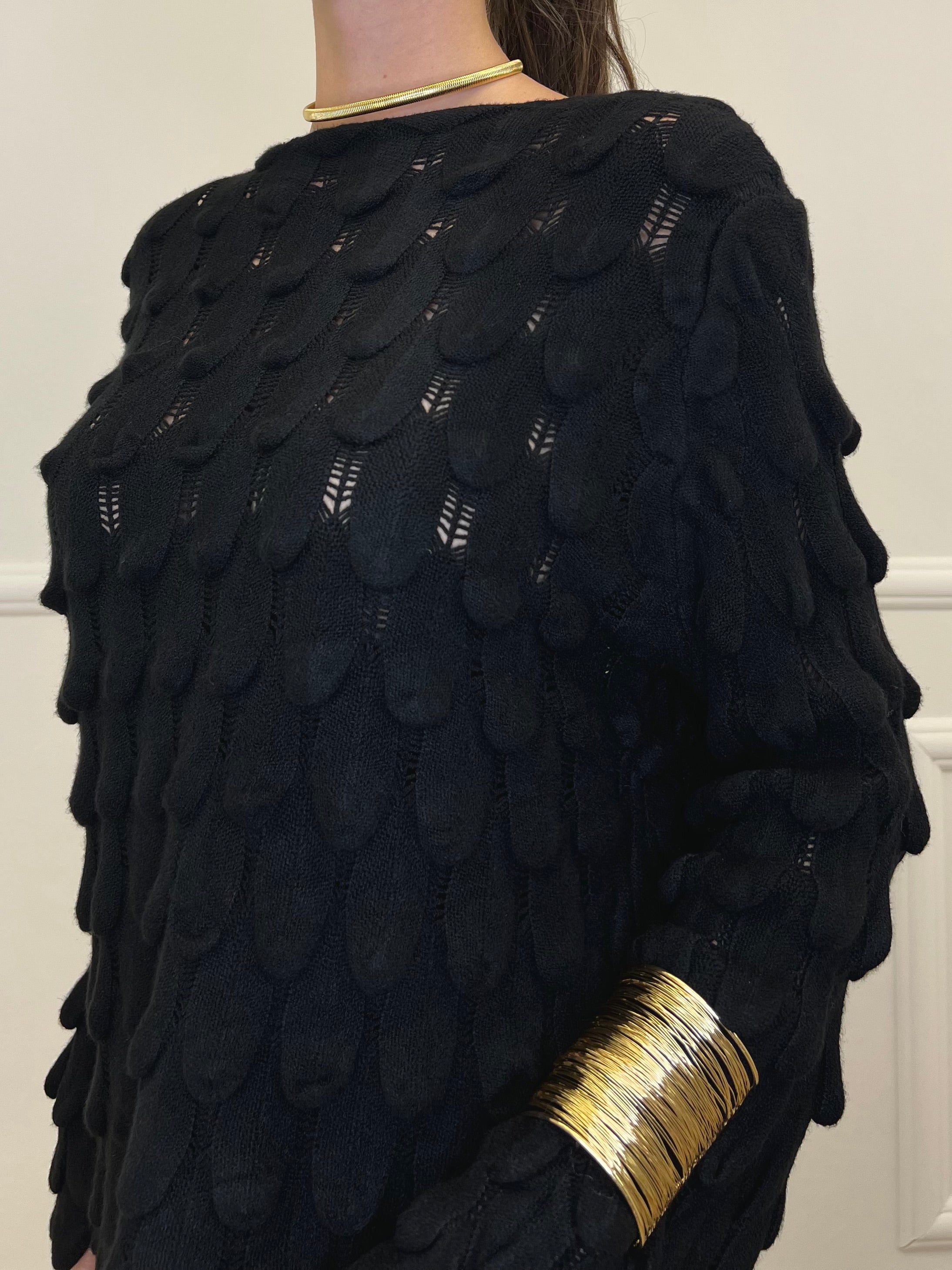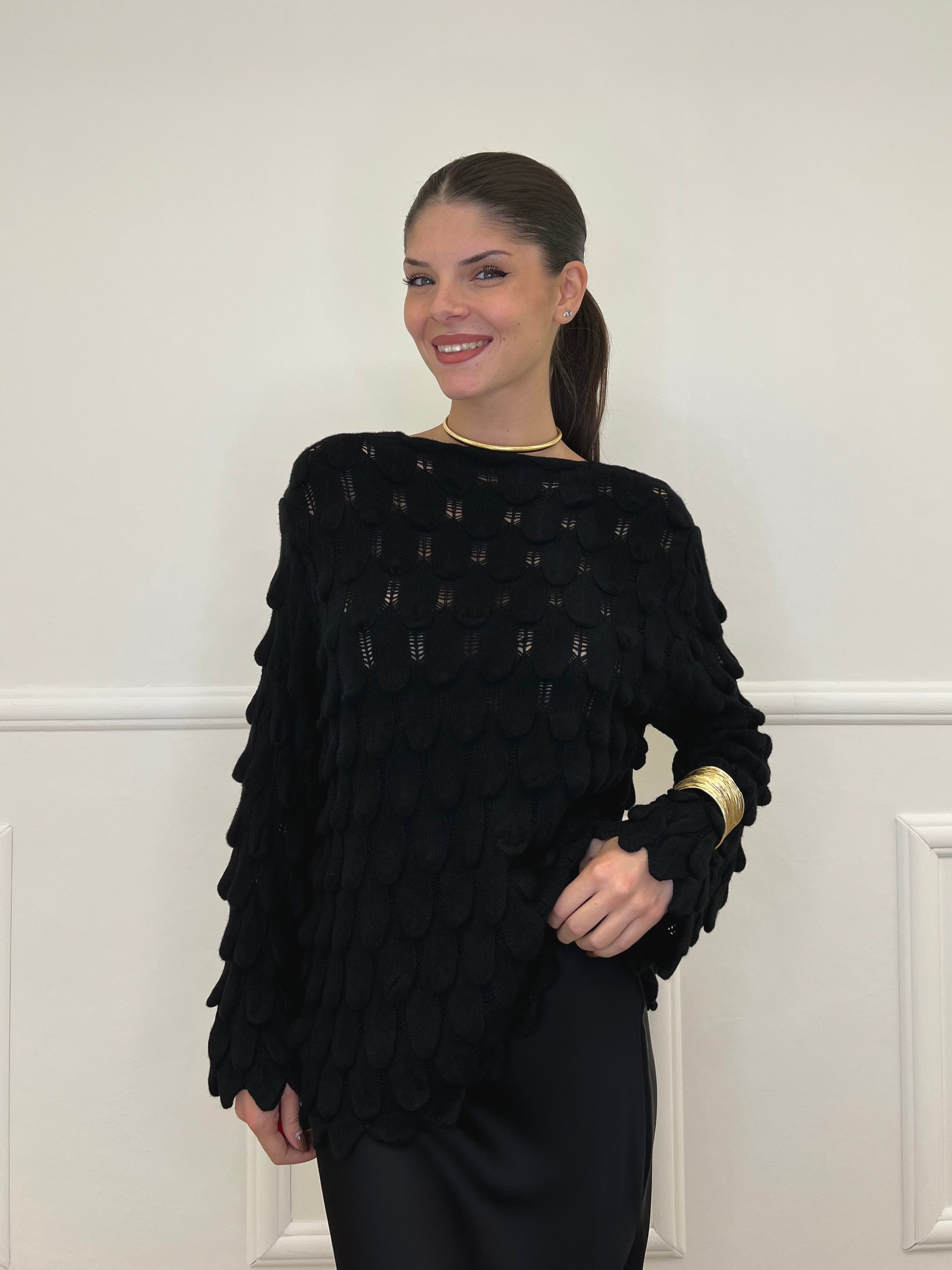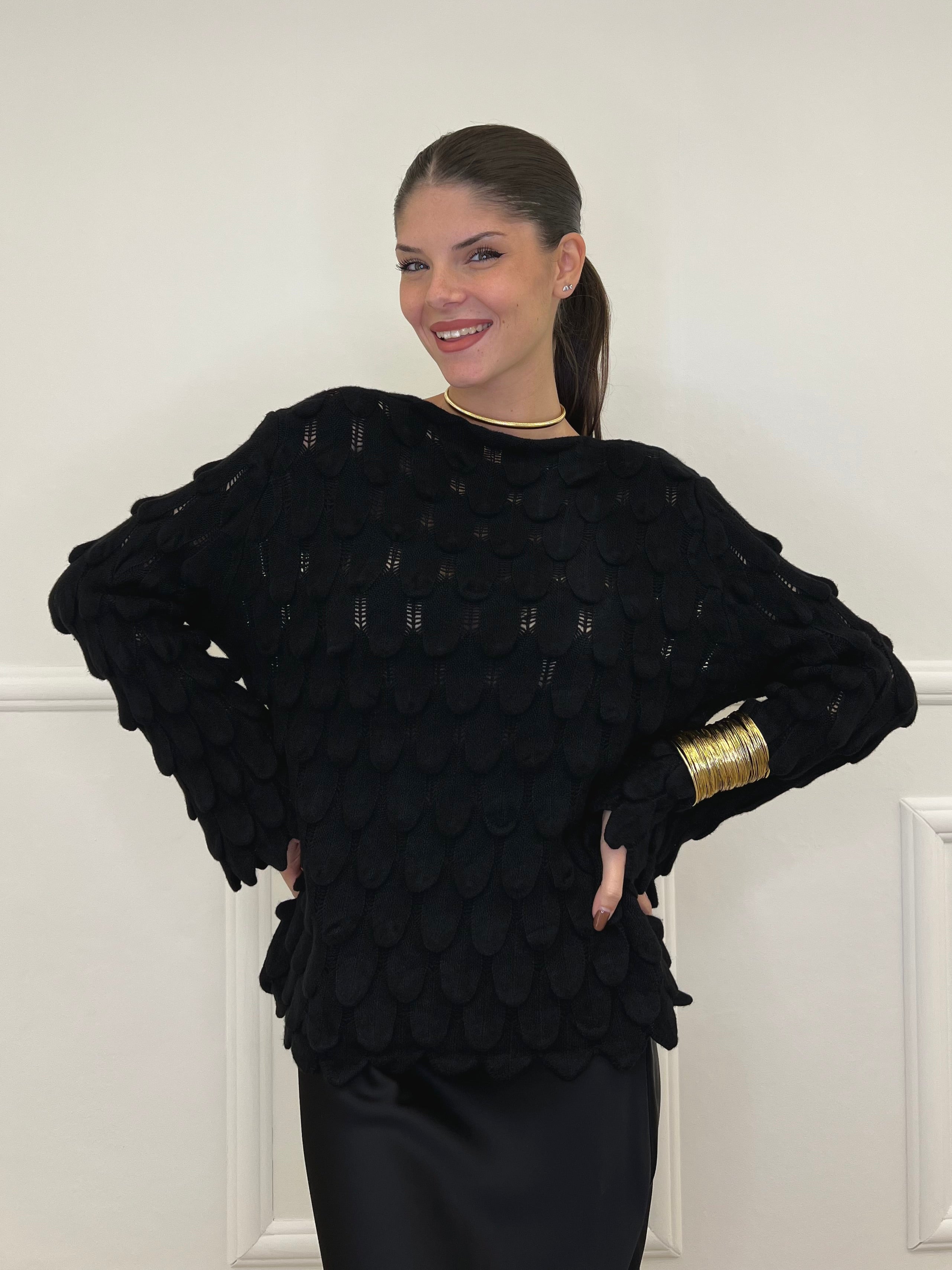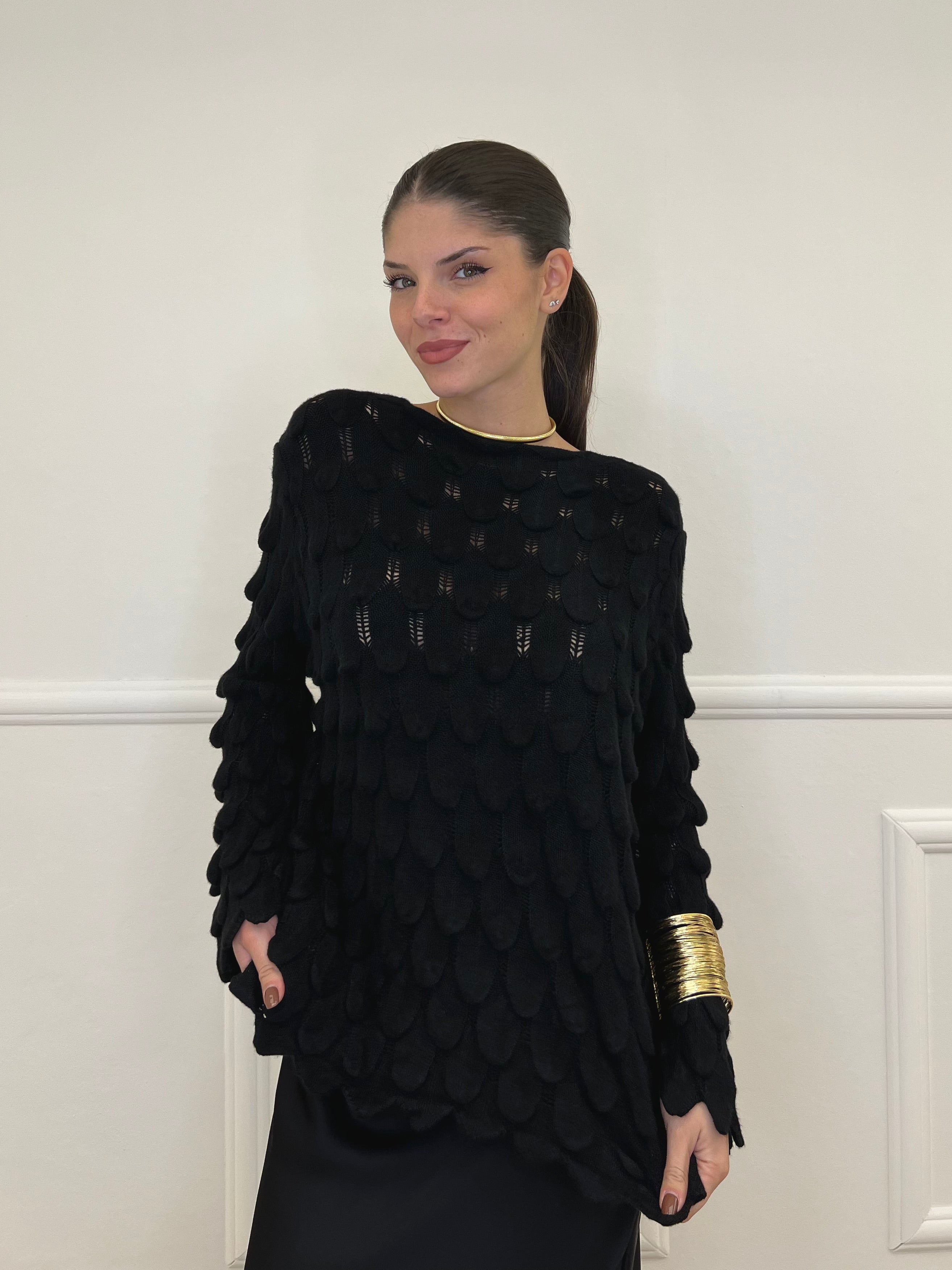 Maglia elasticizzata a girocollo, lavorazione in motivo ananas, con inserti traforati e maniche leggermente a campana.