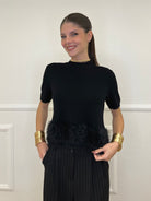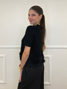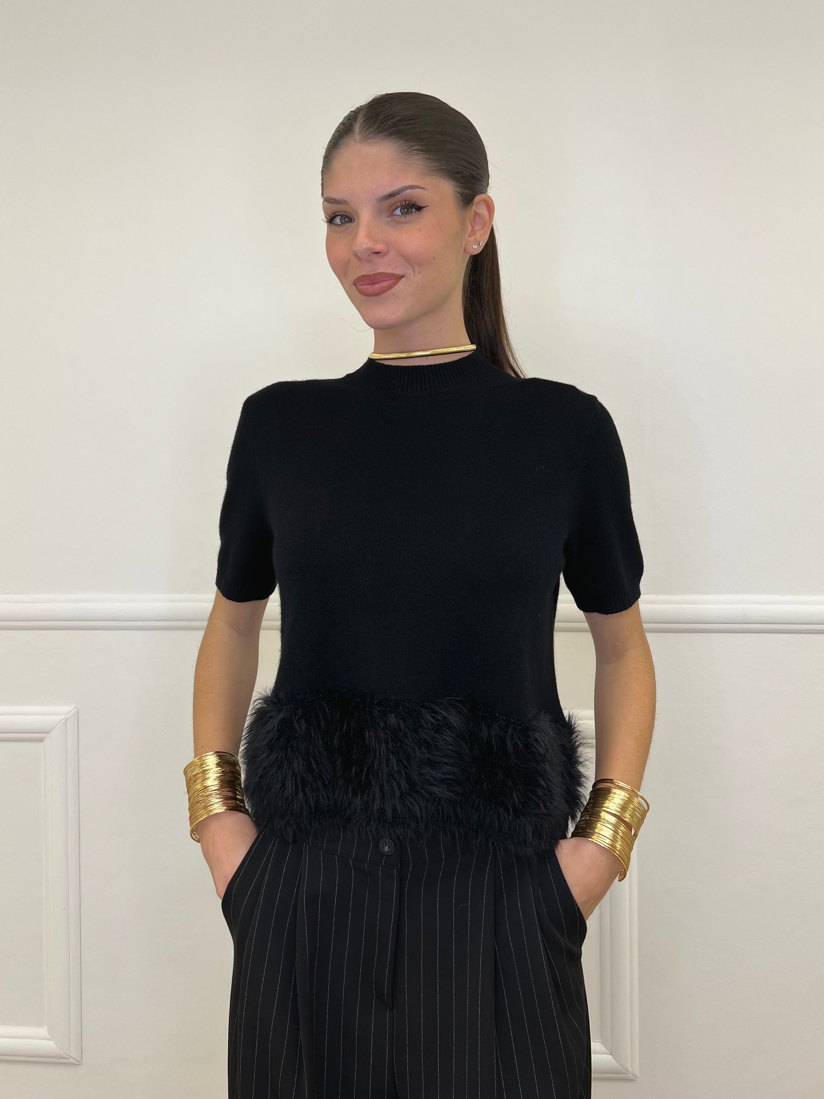 Maglia girocollo a maniche corte in misto viscosa elasticizzata con dettaglio maniche calate e fondo fluffy in eco pelliccia.