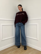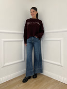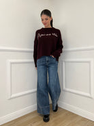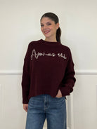 Maglia over a costa inglese in misto lana e alpaca a con profili rimagliati, spacchetti laterali e ricamo frontale a contrasto in rilievo.