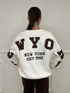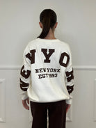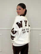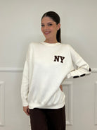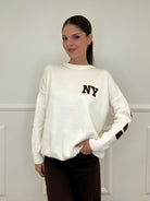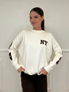 Maglia over super elasticizzata in doppio filo di viscosa con profili rimagliati, manica scesa e ricami a contrasto in rilievo, frontale, posteriore e sulle maniche.