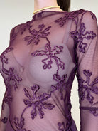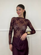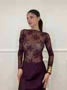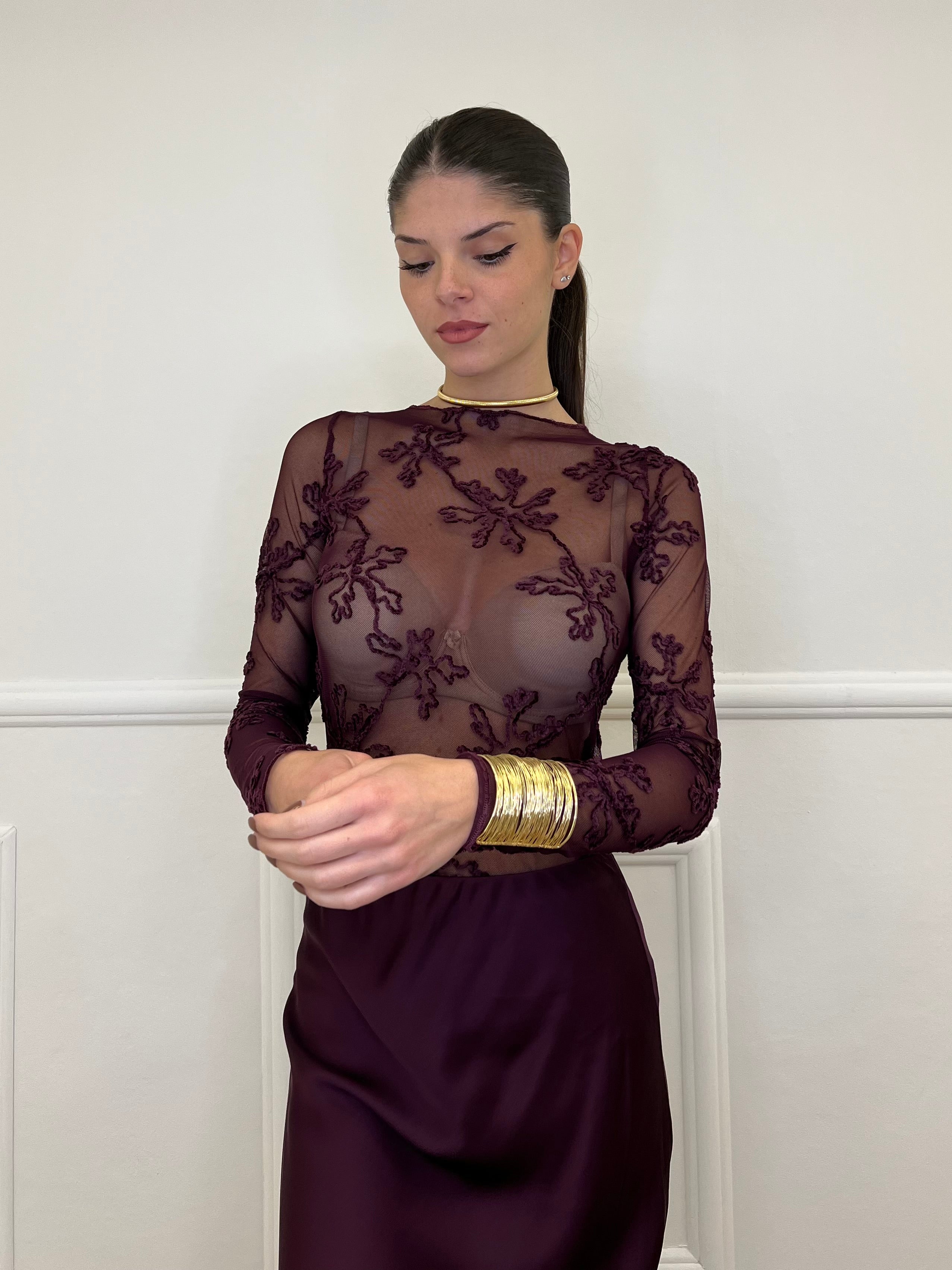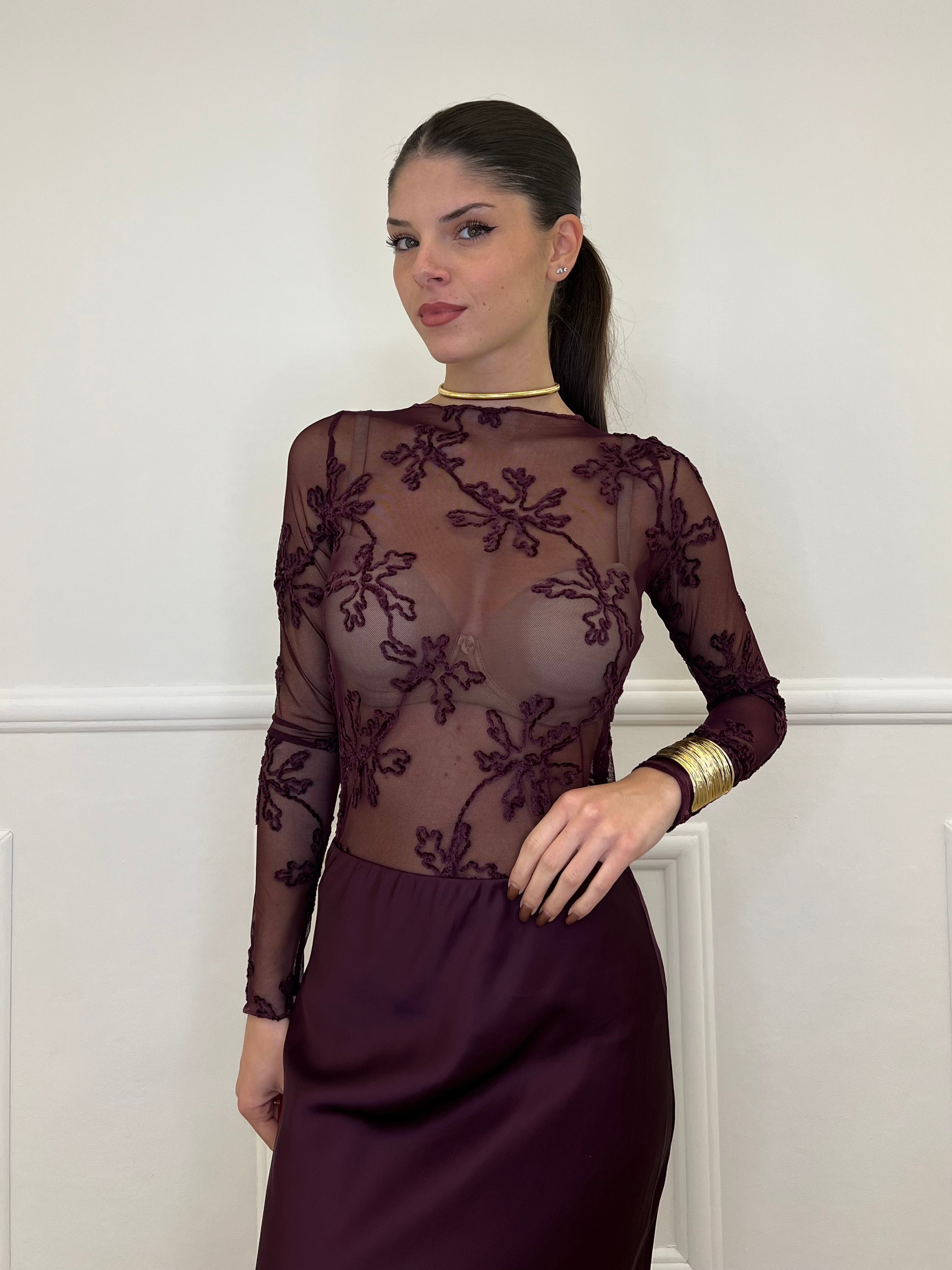 Maglia in tulle elasticizzato con ricami in rilievo in velluto tono su tono.