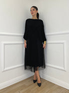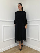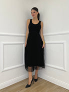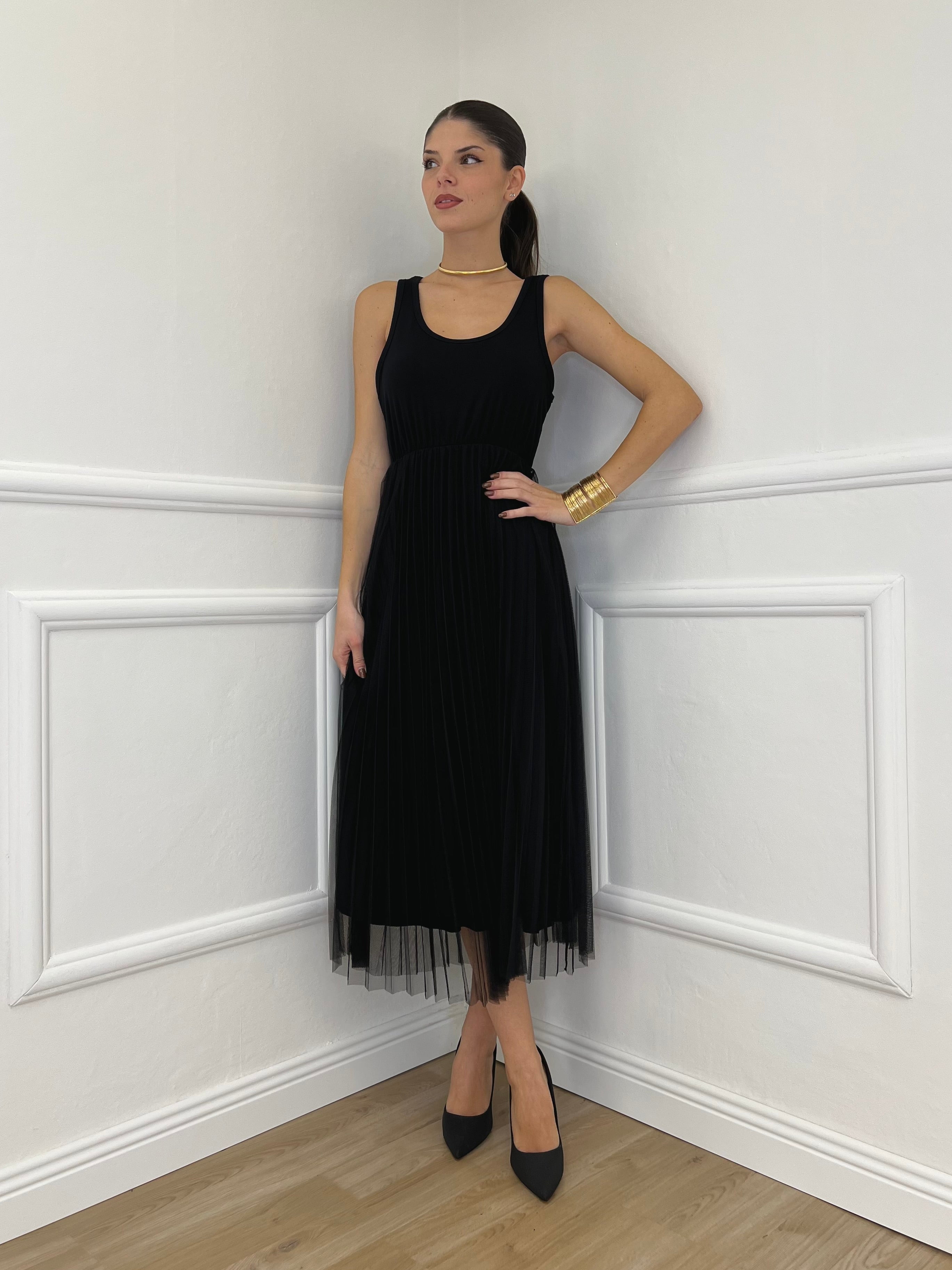 - Abito sottoveste smanicato, in tulle plissettato, con fodera in viscosa elasticizzata.