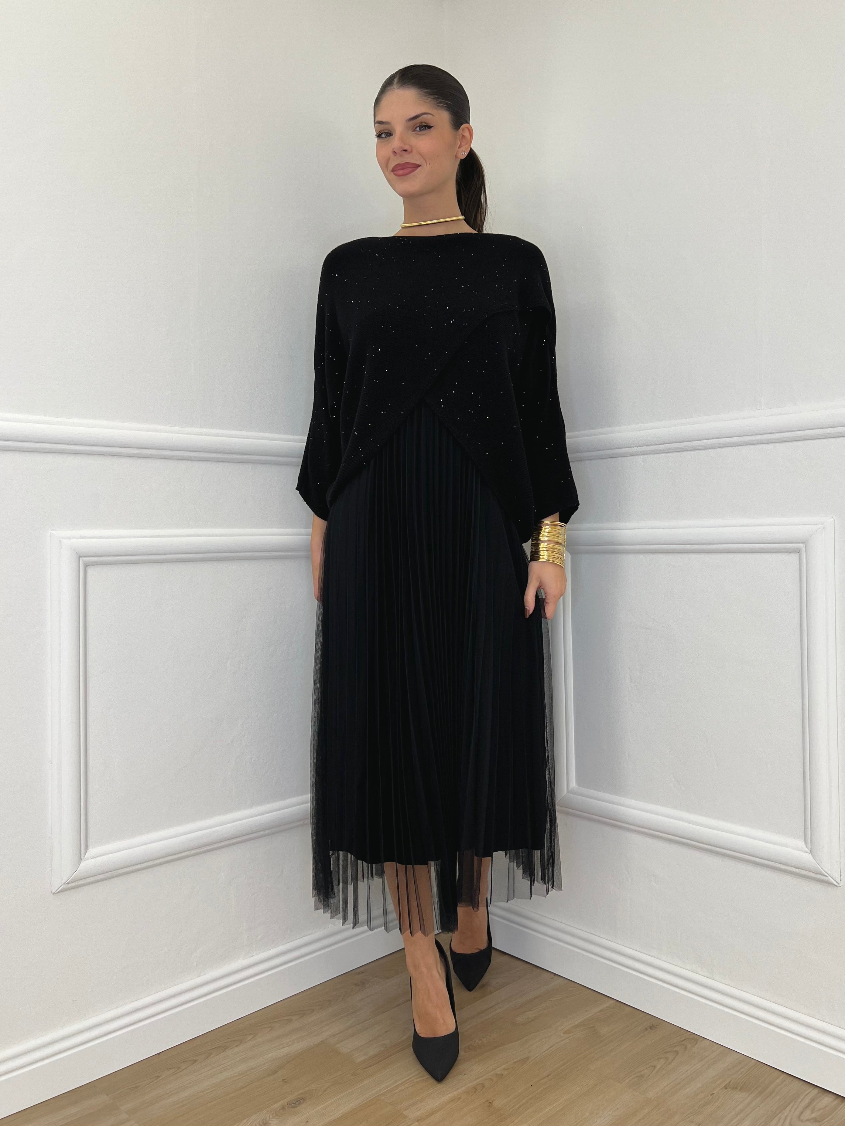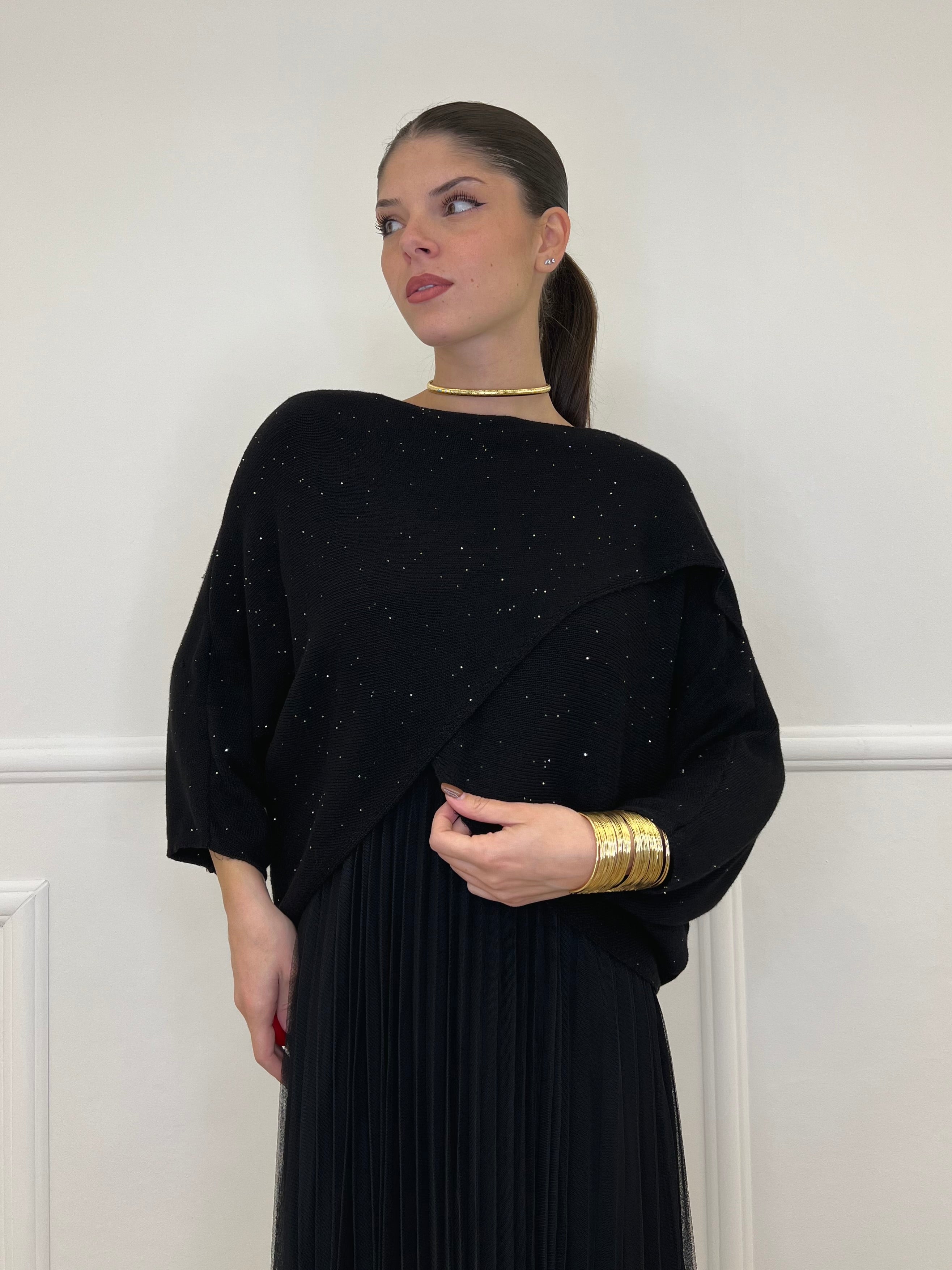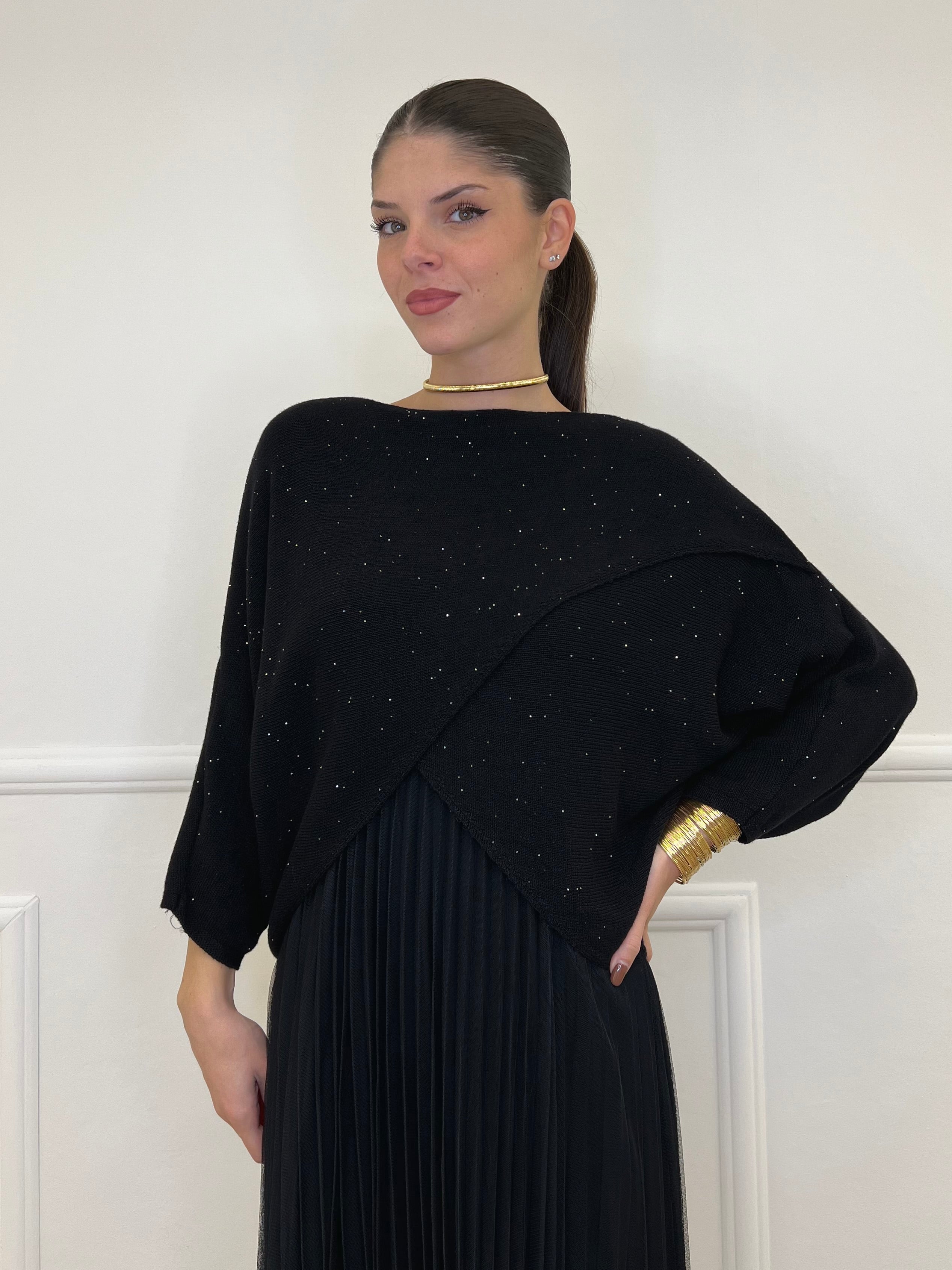 - Maglia over sormontata in misto viscosa elasticizzata con micro paillettes e maniche a pipistrello;
