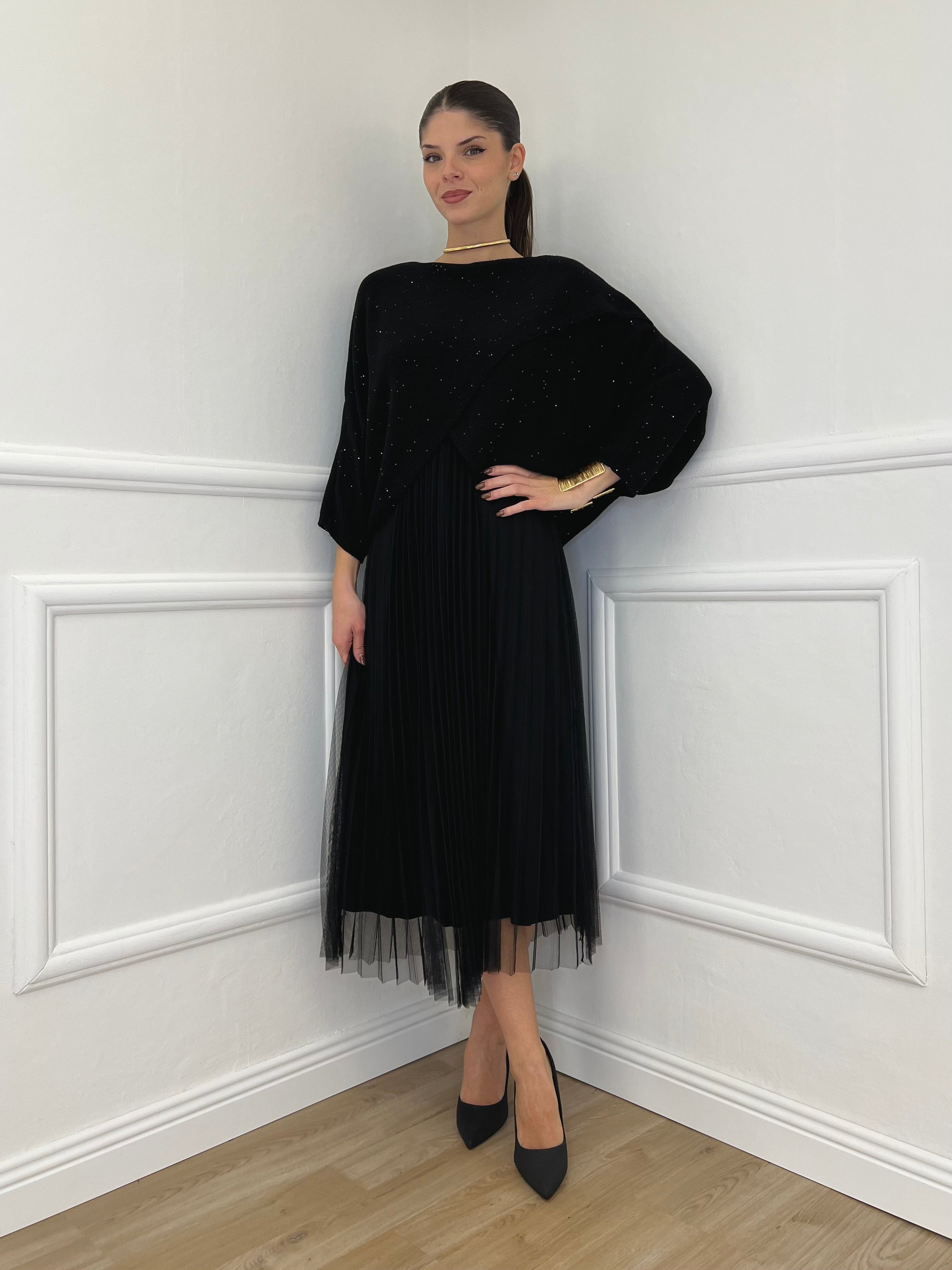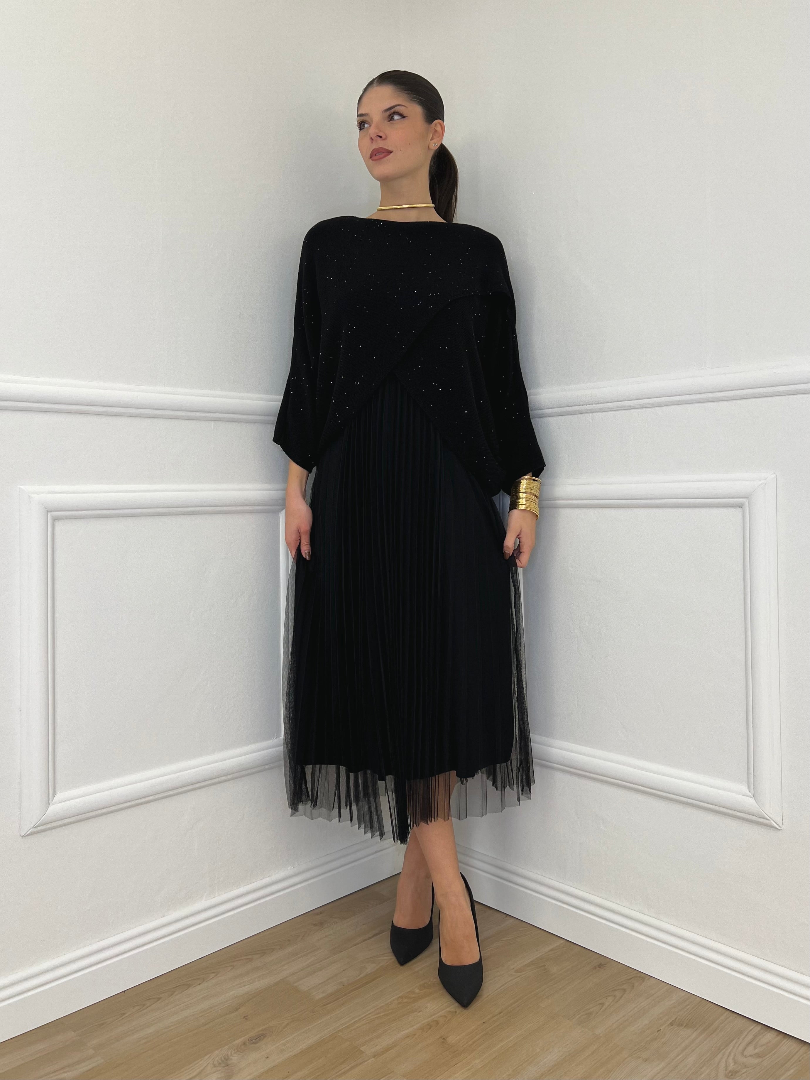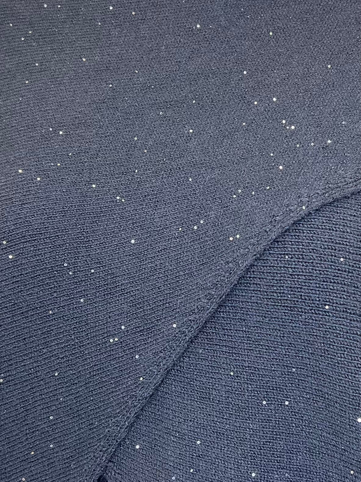 - Maglia over sormontata in misto viscosa elasticizzata con micro paillettes e maniche a pipistrello;