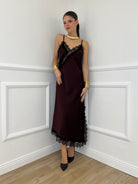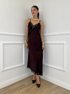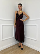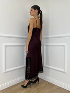 Asymmetrical satin dress with lace inserts and adjustable shoulder straps.