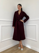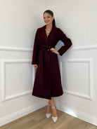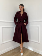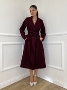 Double-breasted coat lined with wool, featuring reinforced shoulders. Belt loops and a removable belt detail at the waist.