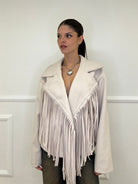 Oversized, lined coat jacket with double-breasted fastening, side pockets and wide lapel collar with fringes.