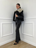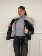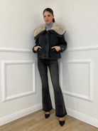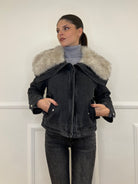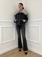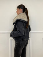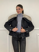 Padded denim jacket with faux fur inserts and a quilted interior with eco-friendly padding. Wide collar, side pockets, and a concealed zip closure.