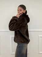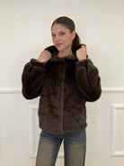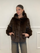 Shaved faux fur, mink effect, in reversed sheepskin, with hood, side welt pockets and snap button fastening.