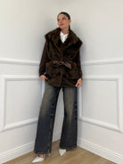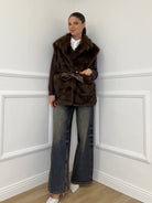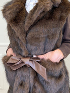 Sleeveless, mink-effect faux fur coat with a lined interior, belt loops, and front patch pockets. Removable faux leather belt detail and concealed snap closure.