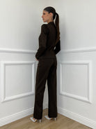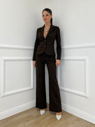 • Medium-high waisted palazzo trousers with side and back pockets and belt loops.