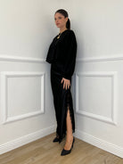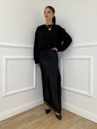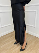 Asymmetrical satin skirt with lace inserts. Elastic waistband, side slit, and bias-cut fabric detail.