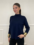 Stretch viscose sweater with a turtleneck and linked trim. Front slit detail and bias-cut fabric.