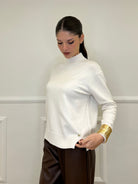 Stretch viscose sweater with a turtleneck and linked trim. Front slit detail and bias-cut fabric.