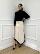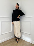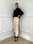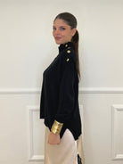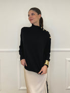Oversized sweater with a volcano neck in a super-stretch viscose blend with dropped sleeves and reverse seams. Gold button detail on the shoulder, linked trim, and side slits.