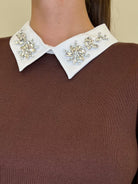 Stretch viscose sweater with Oxford shirt collar and crystal appliqués. Puff sleeve detail and a back keyhole neckline.
