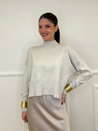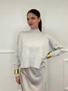 Oversized sweater, short boxy model, in double stretch viscose yarn with volcano neck and linked edges.