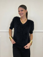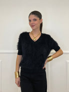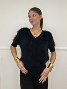 Short-sleeved, English-rib sweater with faux fur, super stretchy with a V-neck and linked edges.