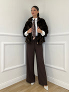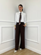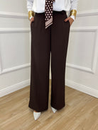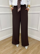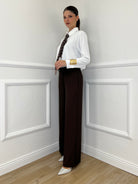 Medium-high waisted palazzo trousers in flowing crepe fabric with side pockets, fake back pockets and waistband with belt loops and elastic back.