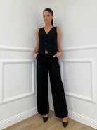 • Palazzo trousers with side American pockets and medium-high elastic waist with belt loops and removable belt included.