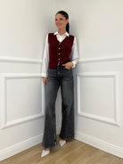 Ribbed viscose knit vest with mother-of-pearl buttons, faux front welt pockets and linked edges.
