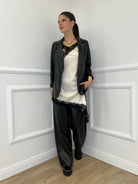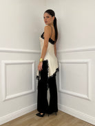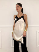 Asymmetrical satin lingerie top with thin straps and lace inserts. Side train detail with slit and bias-cut fabric.