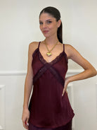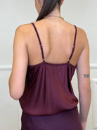 Lingerie top in viscose satin with lace inserts, elastic back and adjustable shoulder straps.