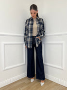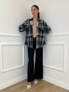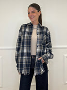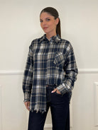 Madras patterned cotton flannel overshirt with front pocket, rounded hem and frayed trim detail.
