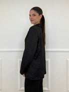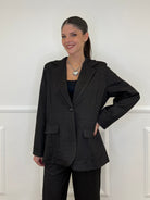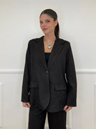 Matching, single-breasted, lined jacket in oversized, two-tone stretch twill. Reinforced shoulders and faux front flap pockets.