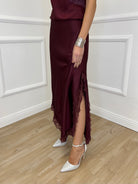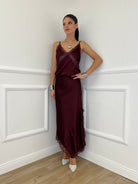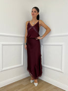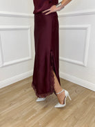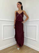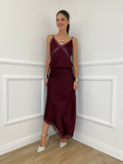 Asymmetrical satin skirt with lace inserts. Elastic waistband, side slit, and bias-cut fabric detail.