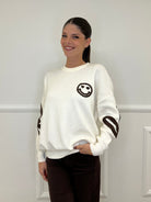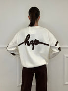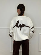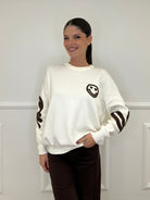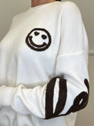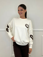 Oversized stretch viscose sweater with linked trims and dropped sleeves. Contrasting sponge embroidery detail on the front, sleeves, and back.